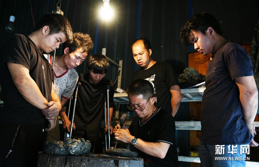 周永平在指导徒弟们学习石砚雕刻(7月30日摄)。 今年50岁的周永平,是贵州省岑巩县思州石砚雕刻技艺传承人。从小受家传砚刻氛围影响,他痴迷上了思州石砚这门独特的技艺,钻研石砚雕刻30余年。 贵州省岑巩县古名思州,思州砚是岑巩县的特产,历史悠久,深受文人墨客的青睐。一件思州石砚从采石、选料、制胚到制成砚台,需经历近20道复杂工序。工匠会根据每块石材的大小、纹理、造型等,设计雕刻出不同的造型图案。 近年来,周永平在当地“名工匠”等政策的鼓励和扶持下,成立了公司,并建立了思州石砚非遗传承保护性示范基地,同时广收门徒,免费授艺。“不让这门老手艺失传,让一块块冰冷的石头变得更有内涵和生命力。”周永平说。 如今,周永平在思州石砚传统雕刻工艺中融入当代艺术表现形式,并积极与市场接轨,开发出物美价廉、便于携带的思州石砚旅游商品,“点石成金”,让这门老手艺在传承中焕发新生机。 新华社记者 杨文斌 摄